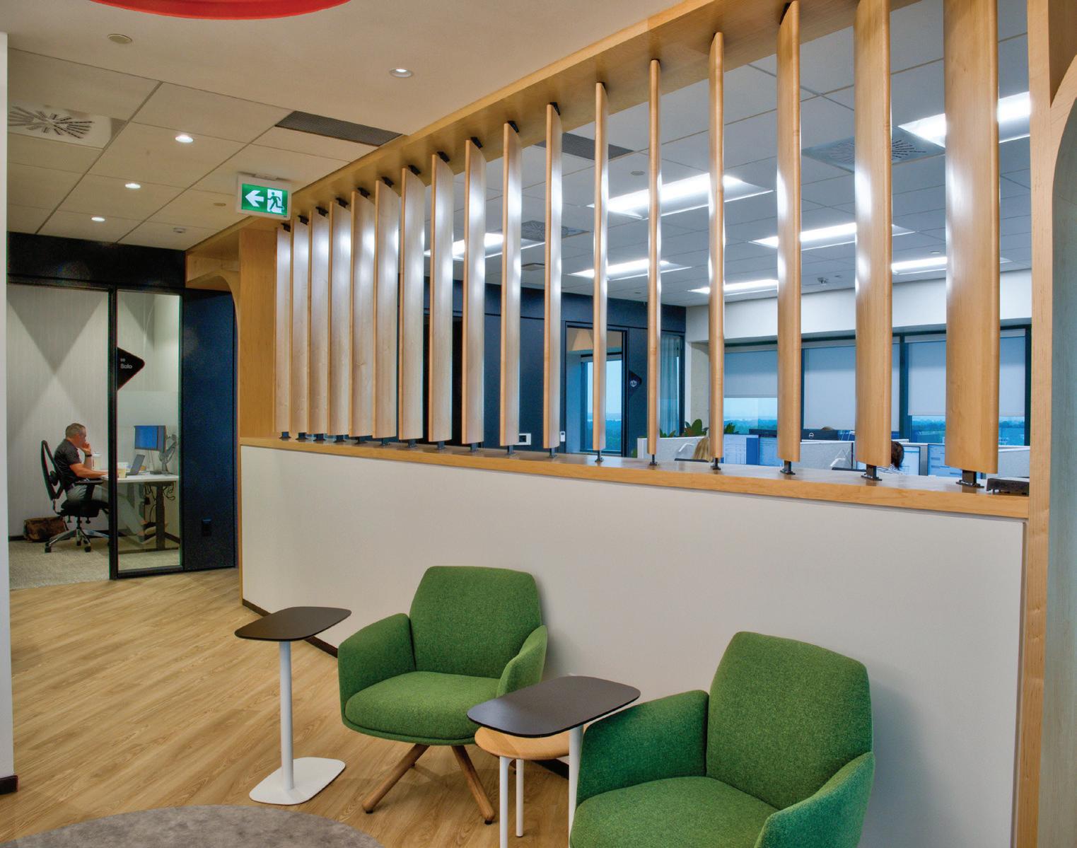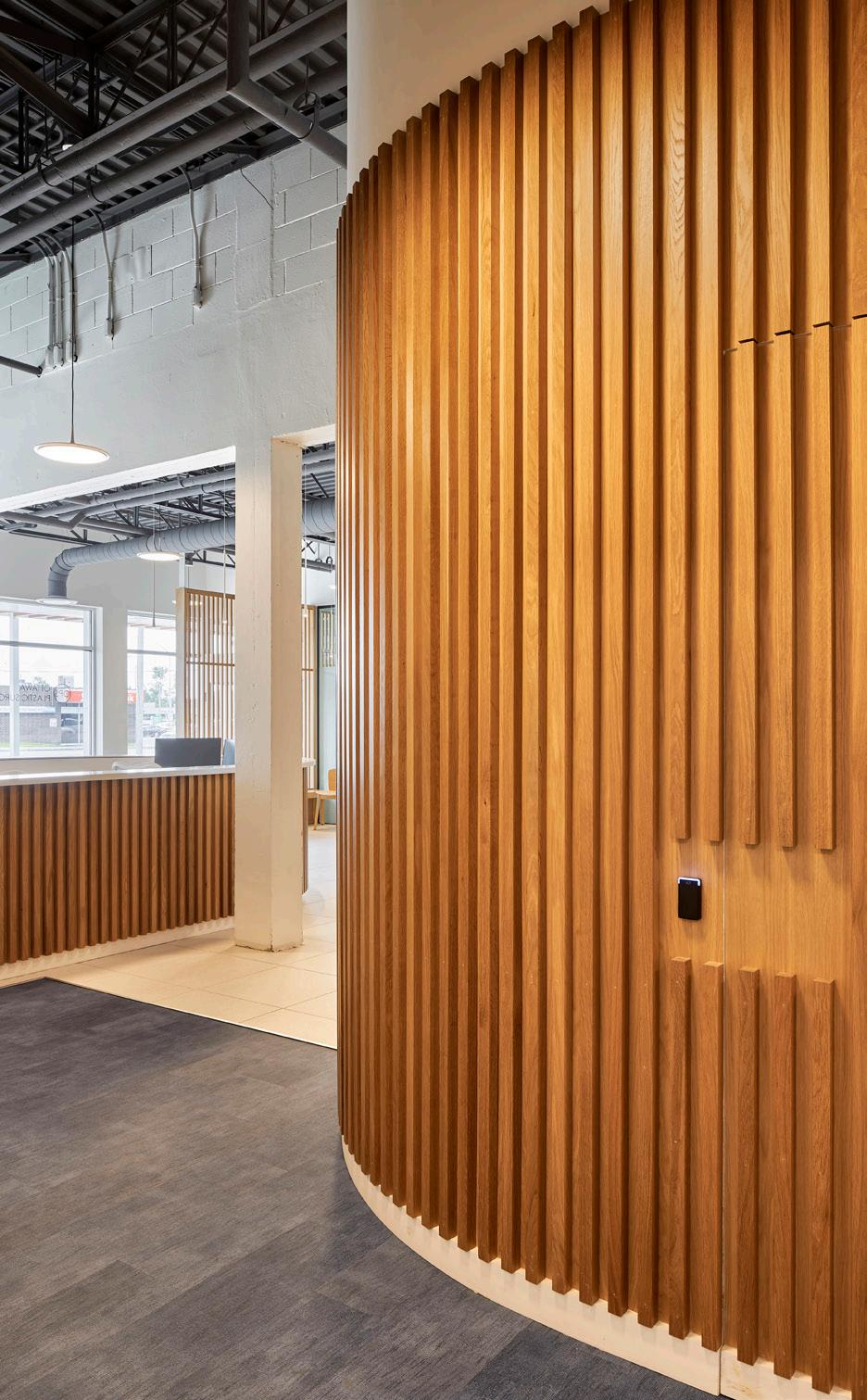 vision also included the separation of the workspace from the communal space. To achieve this, a central feature of the design includes a raised louvre wall that creates a visual and physical barrier between the two. The louvre also creates direct and indirect access to daylight from surrounding areas, a return to the emphasis on biophilic design.