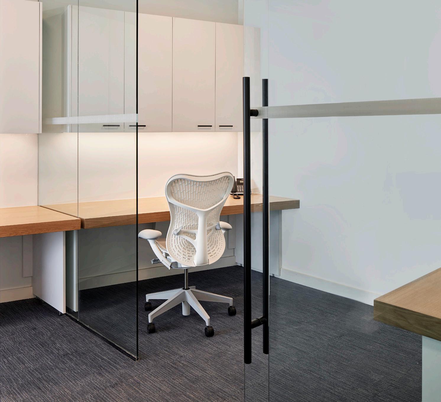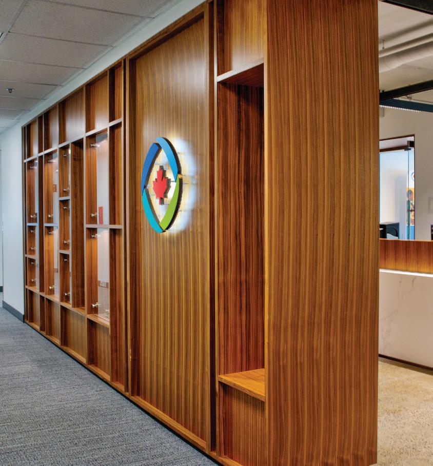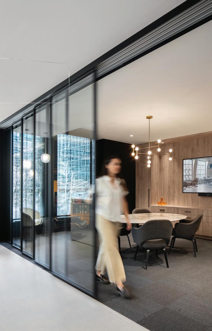 The space was designed by Montreal company FOR Design Planning, which leveraged Falkbuilt for all interior construction of walls and millwork. This construction method allowed for highend finishes and integrated technology, driving design and function in every setting. Smoked-glass meeting room facades, double-glazed private offices and