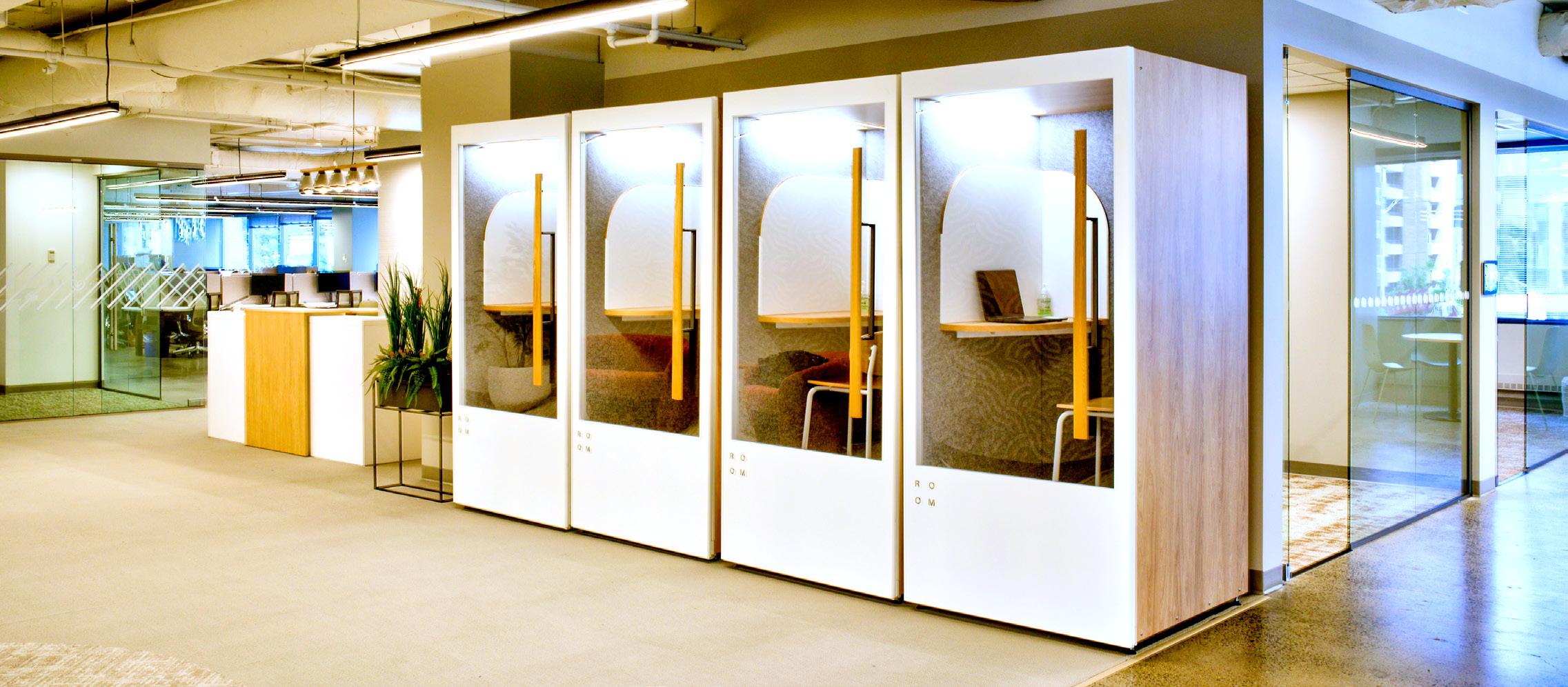 Individual work rooms with sliding glass doors or full acoustic pods offer private spaces for heads-down work or video calls. “We created a space that is progressive,” says Oxley-Harper. “The way it is designed, it gives employees the choice of where to work, and how to work to some degree, recognizing that the nature of work shifts during a day for everybody.”