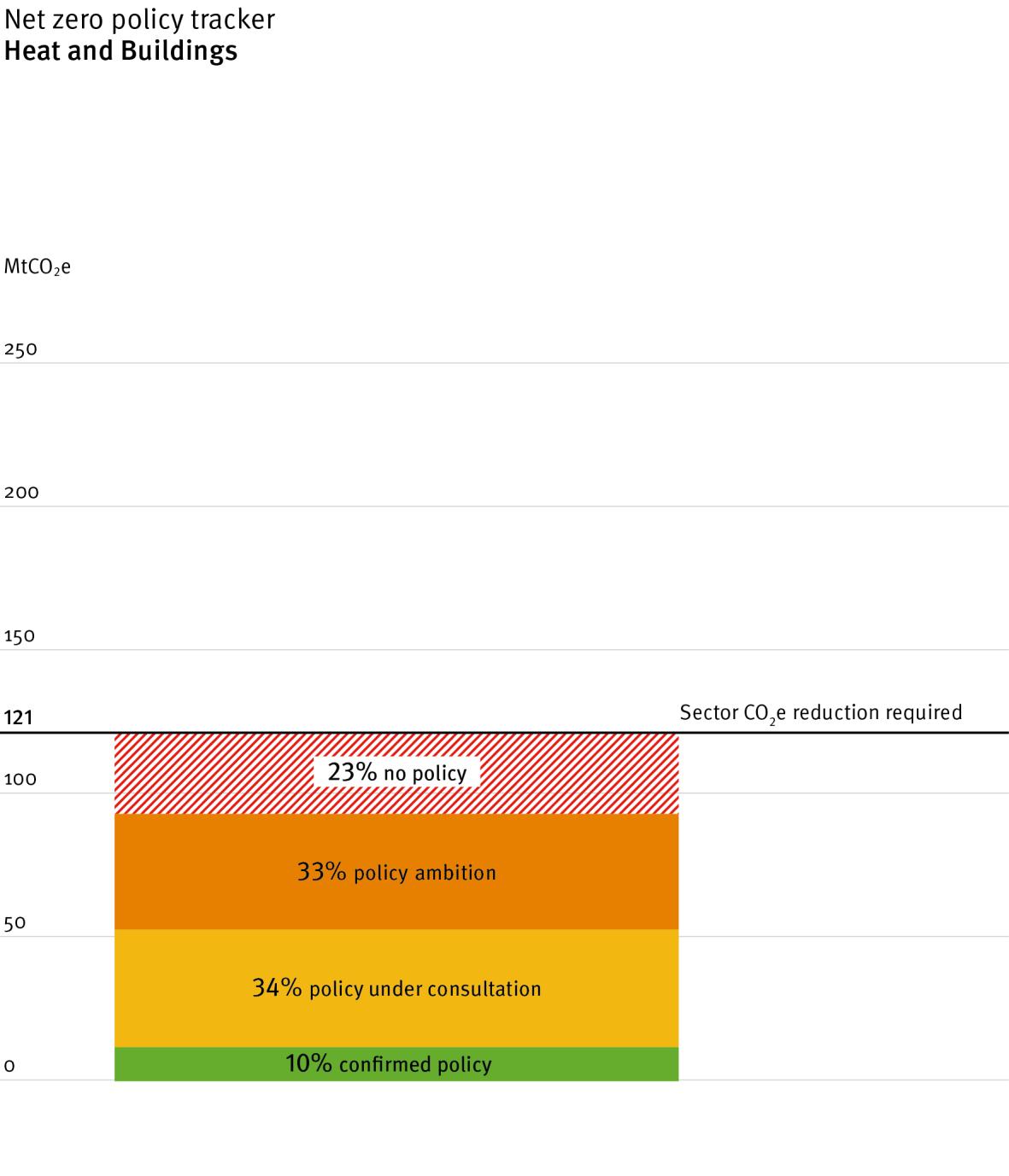Our Net zero policy tracker has monitored the government’s progress towards the goals it set out in the Net Zero Strategy. Our analysis shows that despite some recent progress, the UK remains off track to meet its net zero climate commitment by 2050. Ambition and delivery have been insufficient particularly noting policy roll backs for the heat and buildings and transport sectors.