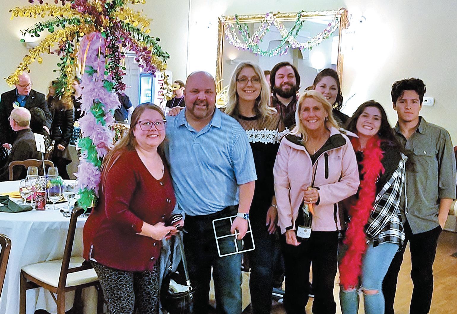 The team from Reliable Title enjoys Trivia Night, having decorated their table with the tall, colorful Mardi Gras centerpiece to their left. Youth Builders of Greeneville hosted the event at Link Hills Country Club Feb. 25.