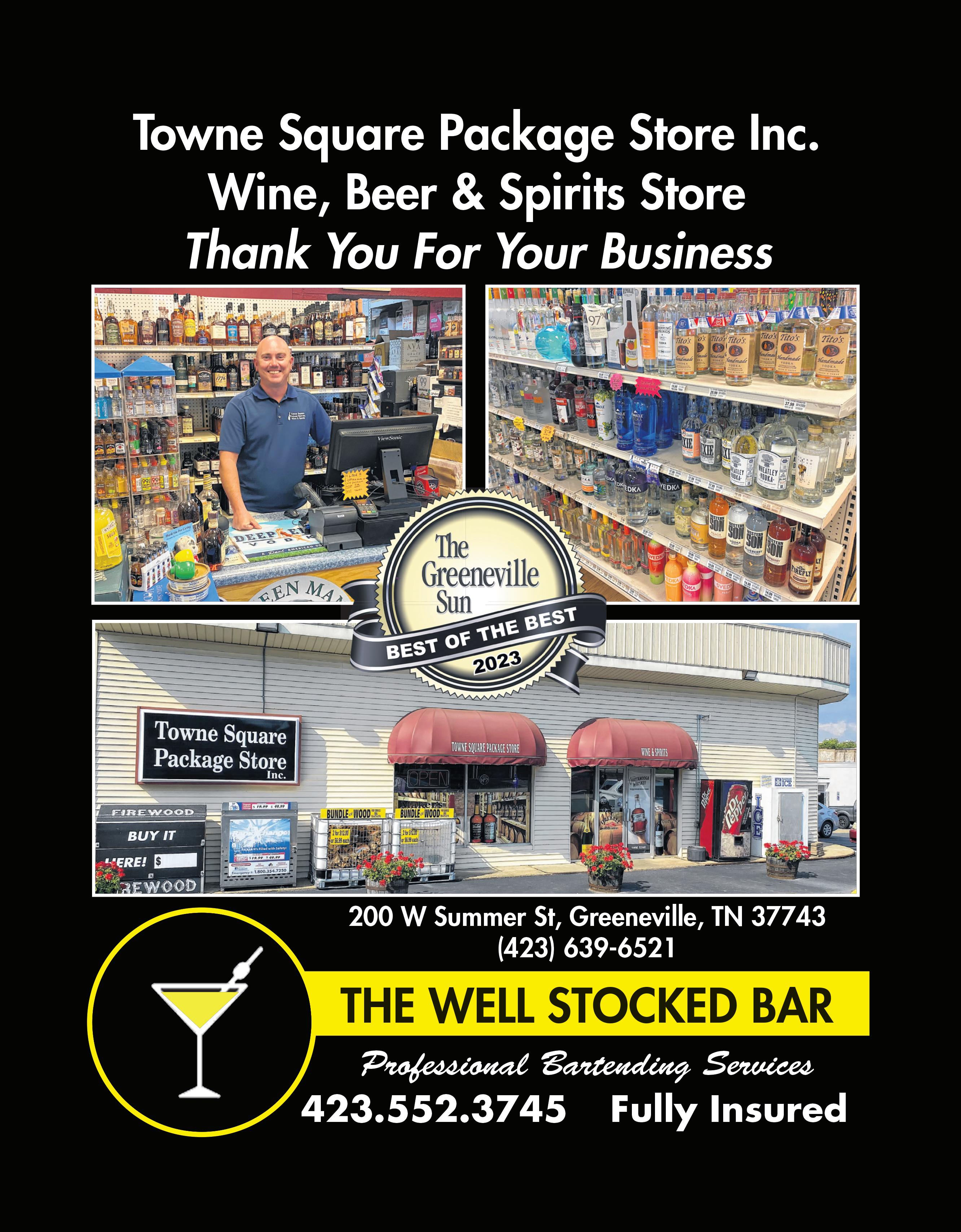 TO ADVERTISE ON THESE PAGES, CALL 423.638.4185 WINDOWS / VINYL SIDING WINE & SPIRITS TIRES TOWING / WRECKERS VETERINARIANS WATER THEATERS White’sWindow & Siding Co. 403 W. Summer Street (423) 639-3100 www.whiteswindows.com Specializing In Atrium Windows&Doors Celebrating 44 Years In Business People’s Choice Winner 22 times EXPRESS WINE &SPIRITS Every Wednesday 10% OffSpirits 1 3100 East A.J. Highway,Greeneville, TN behind Dunkin Donuts (423) 636-0079 Professional BartendingServices THE WELL STOCKED BAR 423.552.3745 Fully Insured Wine • Spirits Beer TOWNE SQUARE PACKAGESTORE 200 W. Summer St Downtown Greeneville 423-639-6521 1044 WSummerStreet Greeneville, TN 37743 (423) 639-7447 Our Services: Brake Repair AC/Heating Maintenance Alignments Tires &Service 423-639-6671 Local &LongDistance Ser vice Available Lock Out Ser vice Available “We Doze-But Never Close!” 24 HOUR SE VICE 2 0 7 S e a t o n Av e . , G r e e n e v i l l e , T N h o p e t o w i n g h o t m a i l . c o m Small &Exotic Animal Medicine nHouse Lab&Pharmacy Surgery •Dentistry Boarding •Grooming Digital Imaging Laser Therapy 2017 2018 2018 2020 Dr.Matt Quillen, DVM Dr.Tracie Neas, DVM Rent the capitol! Live Events |Private Parties Movies |Birthday Parties Live Theatre| Sunday Services corporateevents &Meetings www.capitolgreeneville.org 423.638.1300 |104 SMain St capitoltheatreofgreeneville capitoltheatreofgreeneville CapitolGville