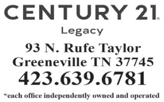 TO ADVERTISE ON THESE PAGES, CALL 423.638.4185 REAL ESTATE RESTAURANTS REAL ESTATE Mikeand LauraMcNeese Local Agents with Global Marketing! Call 423.552.5330 search the MLS at www.mikemcneese.com c21mcneese@gmail.com Double Centurion Producer 122 illage Drive, Suite 1, Greeneville, 377 5 P one: (423) 638-0002 Fax: ( 23) 525-4825 www.uni e title.net The Settlement Companyw ith“U” in Mind 245 E. Andrew Johnson Hwy. Greeneville 639-6311 275 E. AndrewJohnson Hwy. (423) 638-2000 REGIE JONES REALTOR ® JODY JONES REALTOR ® 423.470.3131 423.470.2959 www.RegieJones.com #RegieTheRealtor 107 North Main Street Greeneville, TN 37743 423.845.5800 REGIE &JODY JONES NEW LOCATION ADDINGTON AGENCY JAMIE KELLEY AFFILIATE BROKER #SELLINGEASTTENNESSEE Office: 423.845.580 0 Mobile: 423.747.1086 JamieKelleyRealtor@gmail.com JamieKelleyRealtor.com 600 TUSCULUM BLVD. STE 2GREENEVILLE, TN 37745 EACH OFFICE IS INDEPENDENTLYOWNED AND OPERATED #SellingEastTennessee Thank youfor your referrals. ADDINGTON AGENCY
