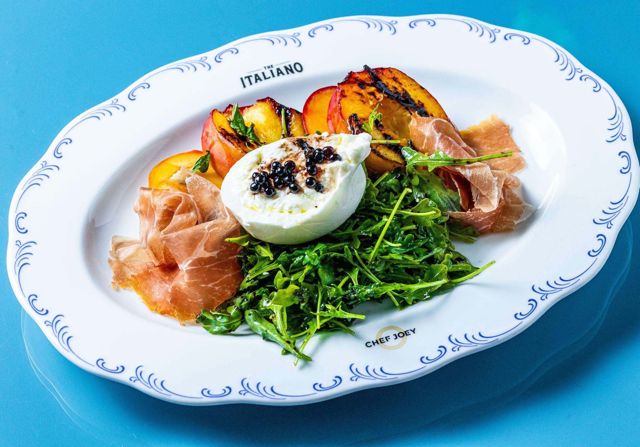 Cut the peach in half and grill until lightly charred. In a bowl, toss the arugula with olive oil, half of the balsamic glaze, kosher salt, and black pepper. Cut each grilled peach in half once more and shingle the slices on one side of the plate, then drizzle with the remaining balsamic vinegar. Pile the arugula salad on the remaining half of the plate and sprinkle with fresh mint. Cut the burrata ball in half and place the cut side up on top of the arugula. Finish by spooning the balsamic pearls over the burrata and seasoning with a touch of olive oil, salt, and pepper.