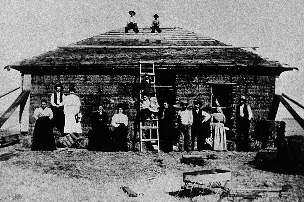 One of the first bale homes owned by the Simonton family, 1890s settlers in western Nebraska, made from baled meadow grass.