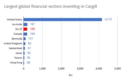 Finance from the EU financial sector contributes to commodity production and trade linked to ecosystem destruction even when the physical products never reach the EU. For example, a Trase report found that transnational commodity trader Cargill (see profile and case study) is estimated to have links through its supply chain to over 15,000 ha of deforestation and other ecosystem conversion for soya cultivation in Bolivia in 2021 alone,75 with almost all of the production destined for South American markets.76 The analysis for this report revealed that Cargill has received $11.5bn (€10.6bn) in credit since 2016 and benefits from $195m (€179m) in current investment from EU-based FIs. Regulating ecosystem risk finance offers a chance to reach this type of activity, where regulation of physical imports to the EU cannot. Future analysis may identify additional commodities with significant ecosystem risk globally that are not currently considered in EU legislation but to whose production EU finance nevertheless contributes.