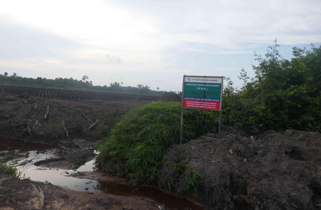 A sign about peatland protection beside a palm oil nursery in the concession of PT Lahan Agro Inti Ketapang. Greenpeace Indonesia researchers visited the concession and were able to document newly deforested areas. 6 August 2023 (1°32'21.16"N - 109°21'36.09"E). Greenpeace Indonesia.