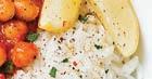 3. For the rice, heat the oil in a large pan and fry the onions over a medium heat for 12 to 15 minutes, stirring, until caramelized and sticky. Stir in the rice and then pour over 4 cups of water and season with salt and pepper. Cover and bring to the boil, then reduce the heat and simmer for 12 minutes. Remove from the heat and leave to stand, covered, for 5 minutes. Fluff up with a fork and stir in the herbs.