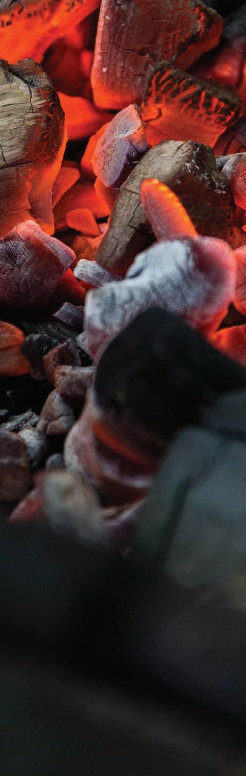 glow, that means medium. Yellow-brown embers with no glow indicate low heat. (You can also hold your palm two inches above the grill—just a couple seconds for high heat, three to four seconds for medium heat, and five to six seconds for low heat—to gauge the heat.)