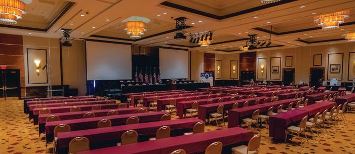 It offers a full-size stage and auditorium with seating for 2,300 and dedicated space for a dance floor. Boasting over 20,000 square feet of space—divisible into six stately rooms ranging from 2,415 to 3,174 square feet—the auditorium can be reconfigured for business meetings, team-building exercises, training seminars, trade shows, formal presentations, luncheons, dinners, banquets, weddings, and more. The expert staff of planners ensures flawless execution to make the most of all occasions.