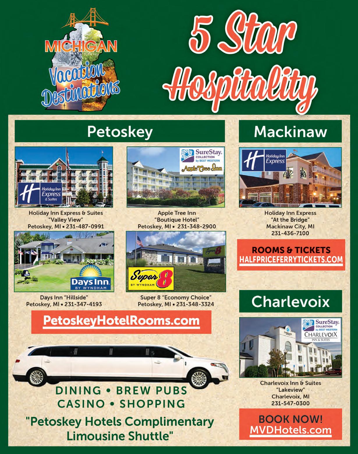 Shepler’s Mackinac Island Ferry.............................................. Sleeping Bear Dunes National Lakeshore............................ Soaring Eagle Casino & Resort................................................ S.S. Badger - Lake Michigan Car Ferry.................................. St. Ignace Visitors Bureau.......................................................... Stafford’s Bay View Inn.............................................................. Stafford’s Crooked River Lodge............................................... Stafford’s Perry Hotel................................................................. Star Line Mackinac Island Hydro-Jet Ferry............................ Thunder Bay Resort...................................................................... Tours Around Michigan.............................................................. Travel Marquette......................................................................... Travel Michigan........................................................................... Traverse City Tourism.................................................................. Visit Lenawee................................................................................ Visit Muskegon............................................................................. Weathervane Terrace Inn & Suites.......................................... W.K. Kellogg Manor House & Conference Center............ Windmill Island Gardens..........................................................