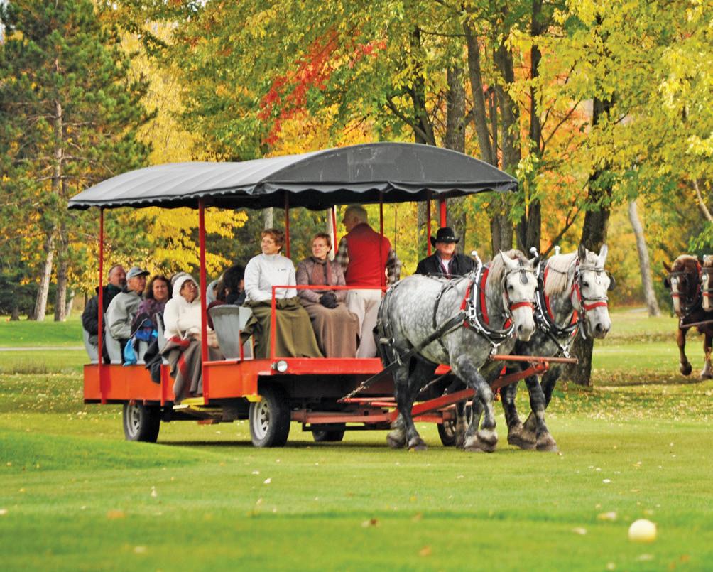 Go over the river and through the woods behind massive Percheron dra horses for a guided ride into Thunder Bay Resort’s beautifully wooded Elk Preserve for a close-up look at majestic Rocky Mountain elk. At the Elk Antler Cabin, decorated in period antiques and trophy mounts, watch as a five-course gourmet dinner is prepared on 125-year-old wood cookstoves while sampling six differ ent wines. Dinner includes apple dumplings with shrimp cocktail, chicken noodle soup, Napa salad and buttery croissants, crown roast of pork, pan-roasted redskins with pan gravy, and white chocolate-mousse-covered pizzelles topped with mixed berry sauce. The experience has been named “Best of the Best” by American Bus Association’s Destinations magazine four years in row.