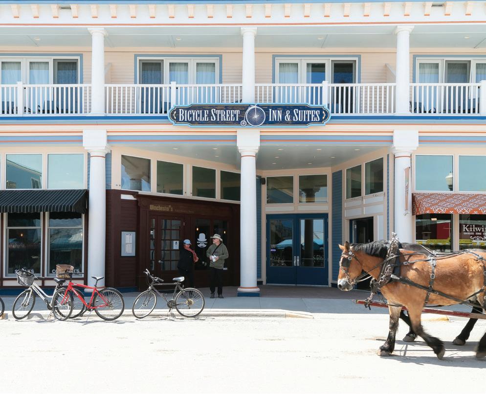 Bicycle Street Inn offers 84 guest rooms and suites ranging up to 700 square feet. Accommodations include balcony rooms with direct waterfront and Main Street views, and balcony suites with panoramic views of the Straits of Mackinac, Main Street, and the interior island. The suites sleep up to six guests with premium bedding and a separate living room with sofa/sleeper. All rooms and suites offer air conditioning, walk-in glass showers, coffee makers, refrigerators, microwaves, and 42-50-inch flat-panel televisions. On the street level, the hotel features Winchester’s Whisky & Bourbon Room, serving cra food and drink in a fun Prohibition-era atmosphere offering an express breakfast, full lunch, dinner, and cocktails.