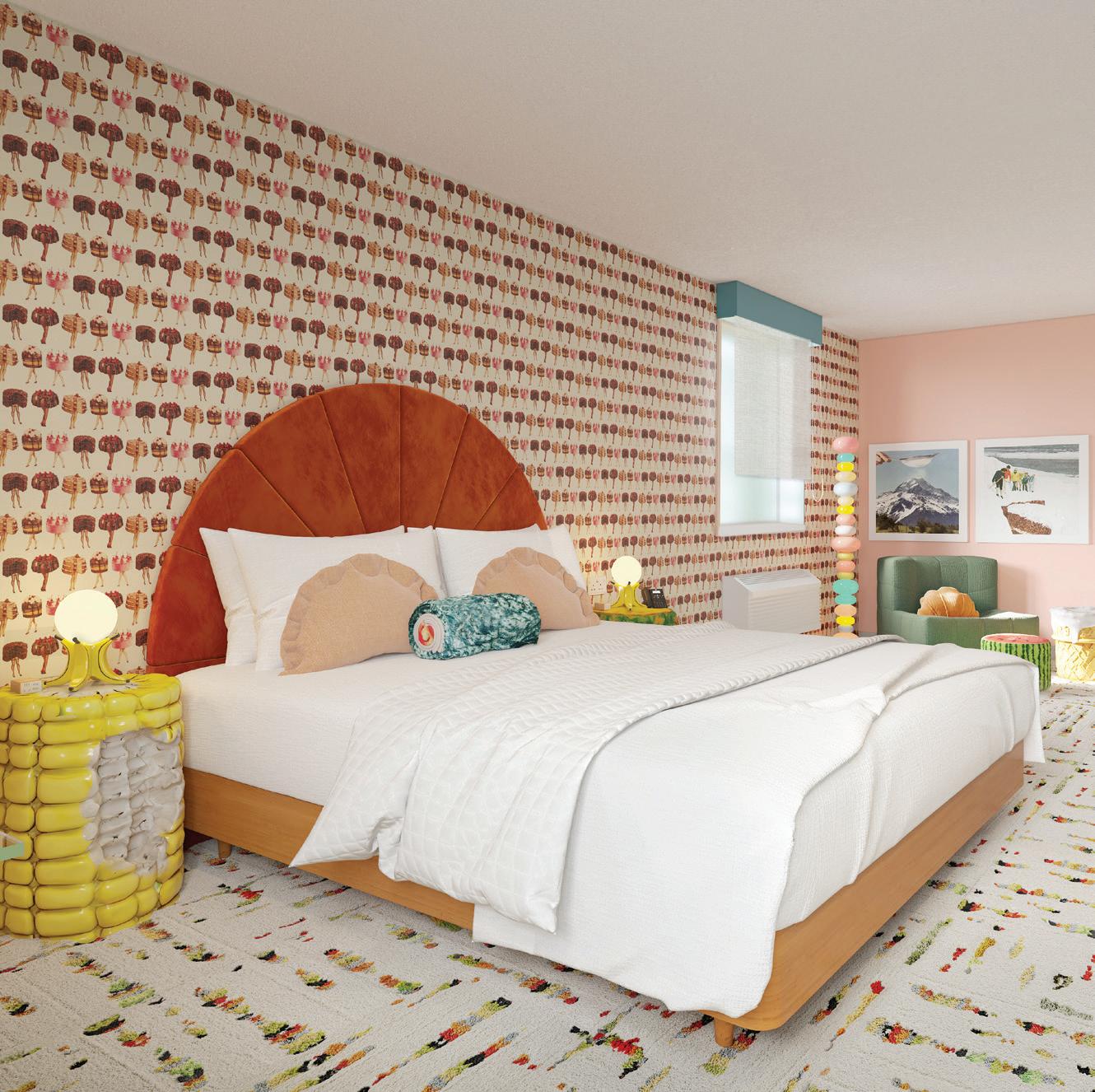 Guest rooms feature artwork and interactive games that reflect the floor’s theme. For example, the Camp Curtis floor transports guests to their favorite sleepaway camp with plaid decor, faux animal heads, wood grain accents, and more. The signature suite on this floor features a night sky with glow-in-the-dark stars. The new decor in all meeting and event spaces mimics candy stripes with colorful patterns on the walls and carpet. thecurtis.com
