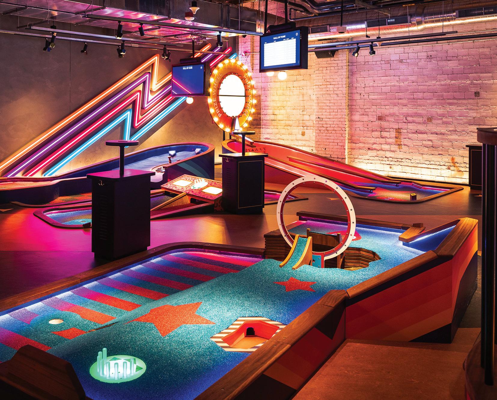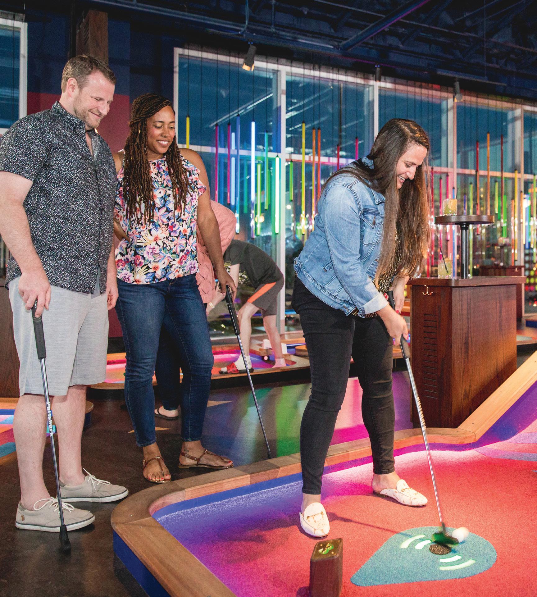 a large patio, and colorful murals by area artists. The 24,500-square-foot space also features a dining area, two bars, and four nine-hole golf courses. “We had such a great experience organizing an event at Puttshack Denver,” says Angela Sun, an event coordinator for Starknet Foundation based in London, England. “The sales manager was super responsive and extremely helpful during the whole planning period before the event. Then, as soon as I arrived to set up, the team was immediately there on hand to help wherever possible. They helped our guests settle in, made sure everyone had drinks, and even put up with me changing the event schedule halfway through so we could play mini golf for a little longer.”