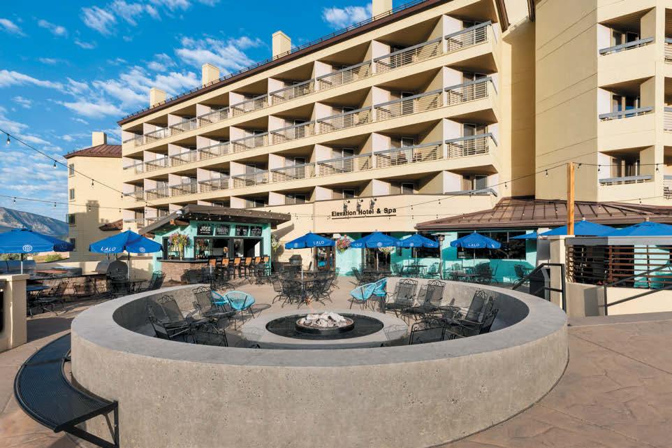Another Denver-based company, Zeppelin Development, delivered something completely new but with a flashback effect. Situated on 3 acres, A-Frame Club in Winter Park features 31 A-Frame cabins; a saloon serving French alpineinspired food and drink; and a heated outdoor deck facing Winter Park Resort. An event lawn with a fire pit extends the property’s ability to host groups.