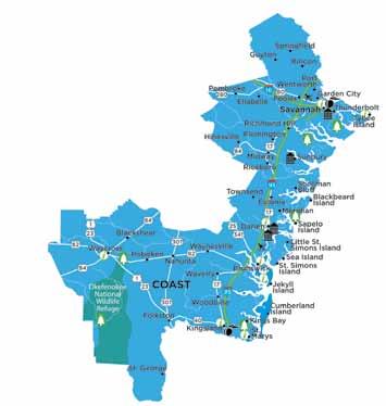 THE COAST Georgia’s storied history began on the Coast, and its colonial charm beckons visitors searching for escape. From enchanting Savannah to the wonders of the Okefenokee and the state’s barrier islands, the Coast is truly a world away.