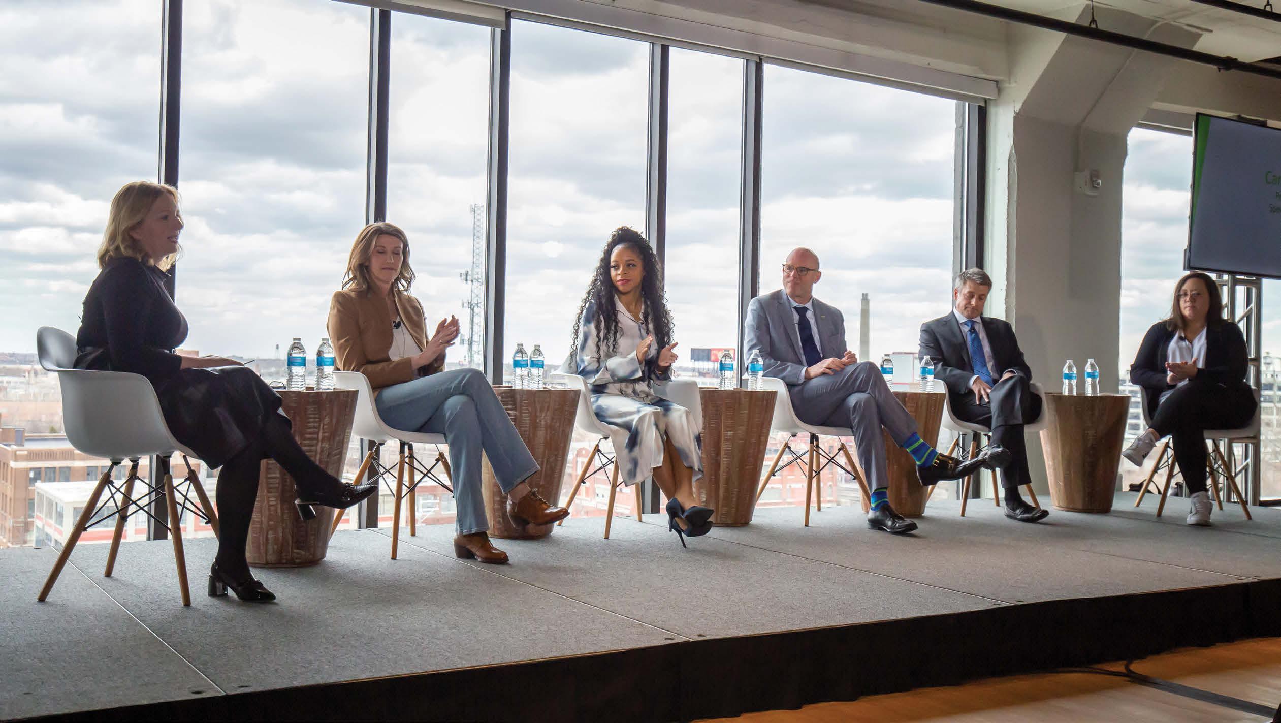 Moderator Carole Galle with panel discussion participants Andrea Gengler, Bethanie Fisher, Claude Molinari, Michael Montri, and Andrea Trudeau