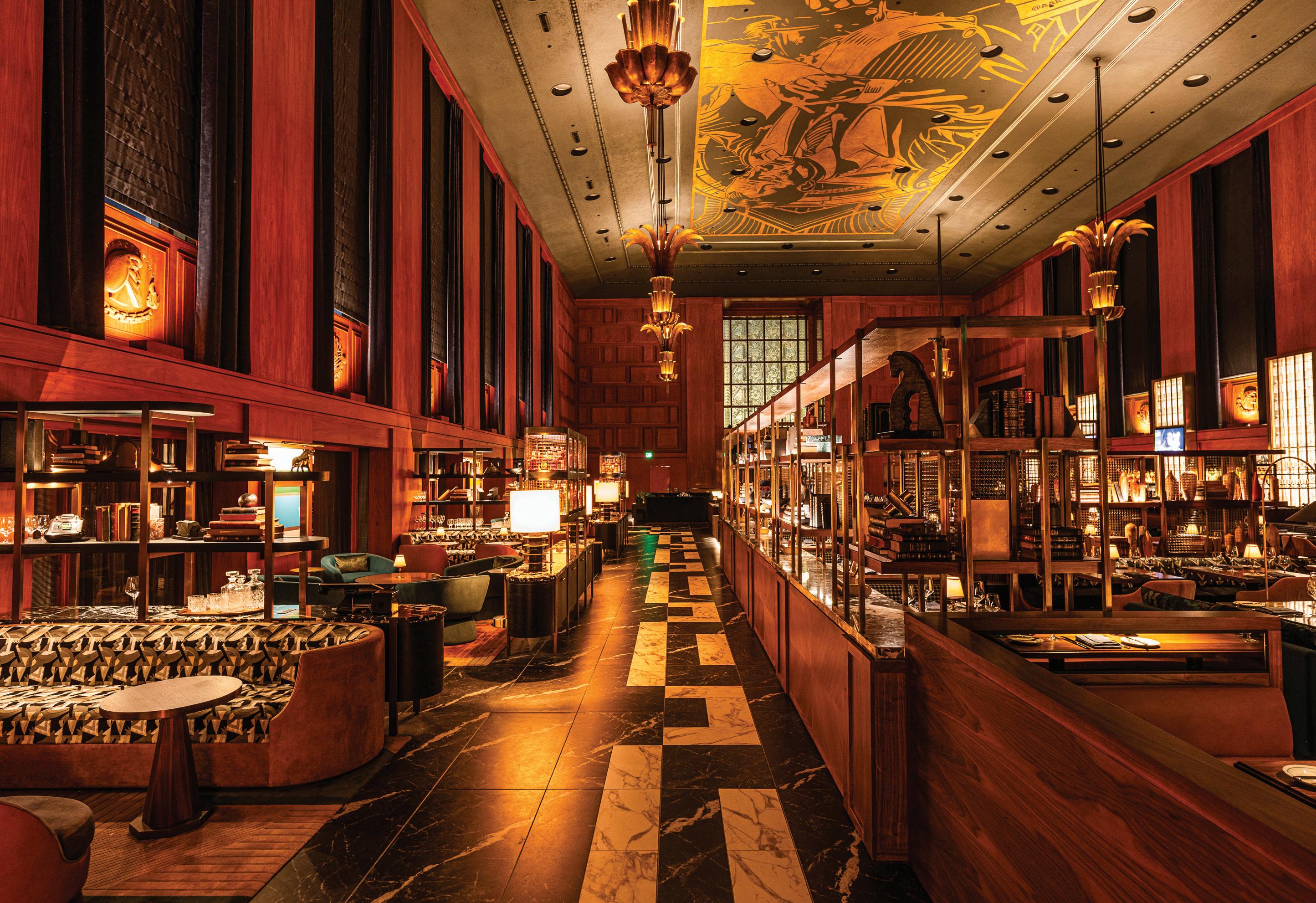 Inspired by the Farmers and Mechanics Savings Bank building’s 1940s art deco architecture, the space blends original features—like teak paneling and six gilded lotus-blossom chandeliers—with additional elegant touches, including custom walnut millwork; rich, jewel-toned furniture; and antique brass banker-wire accents. Spanning 8,340 square feet, the 251-seat restaurant offers three distinct dining experiences: a 90-seat dining room; a lively bar and lounge with a 40-foot central bar and seating for 89; and five private dining rooms, some with semiprivate lounges. A striking mural by artist Aaron Petz of Santa Clara, California, stretches across the 33-foot ceiling, while additional works by regional creators Tara Costello, Tim Tozer, and Jeremy Szopinski complete the space’s bold artistic statement.
