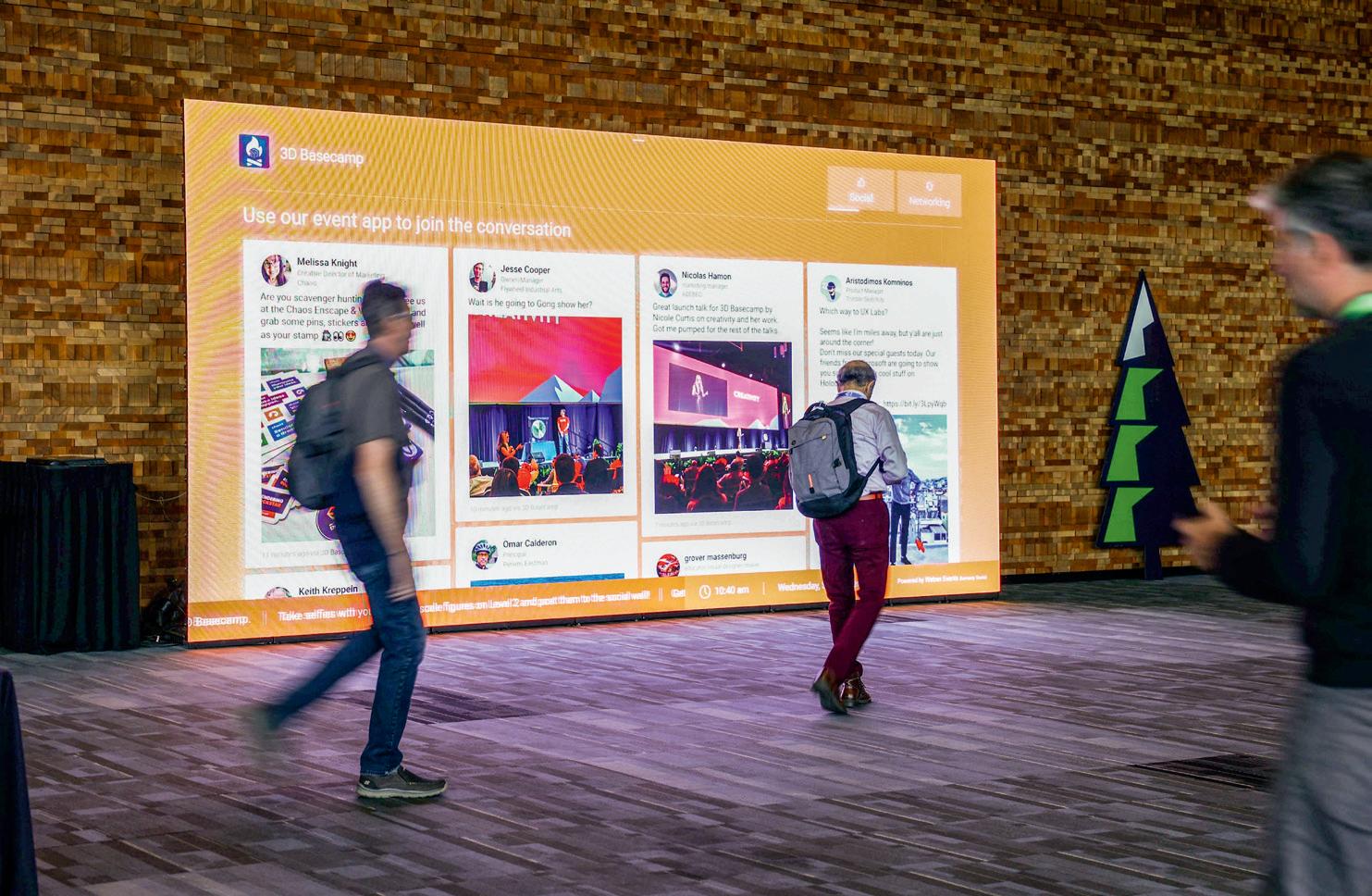 At 3D Basecamp, a 20-foot social media wall connected in real time with the events app. As people uploaded their comments and photos to the app, they appeared on the big wall. The board transformed the solitary act of looking at comments on a phone to a shared group experience. Organizers could also show photos of lost-and-found items, push attendance to different events and trade show booths, give sponsor shoutouts, and reinforce branding. “It was a great way to level up the pushpin board,” Topai says.