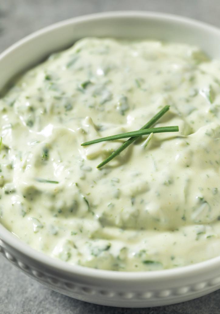 5. In a bowl, combine sour cream, mayonnaise, chives, horseradish, and salt; chill.
