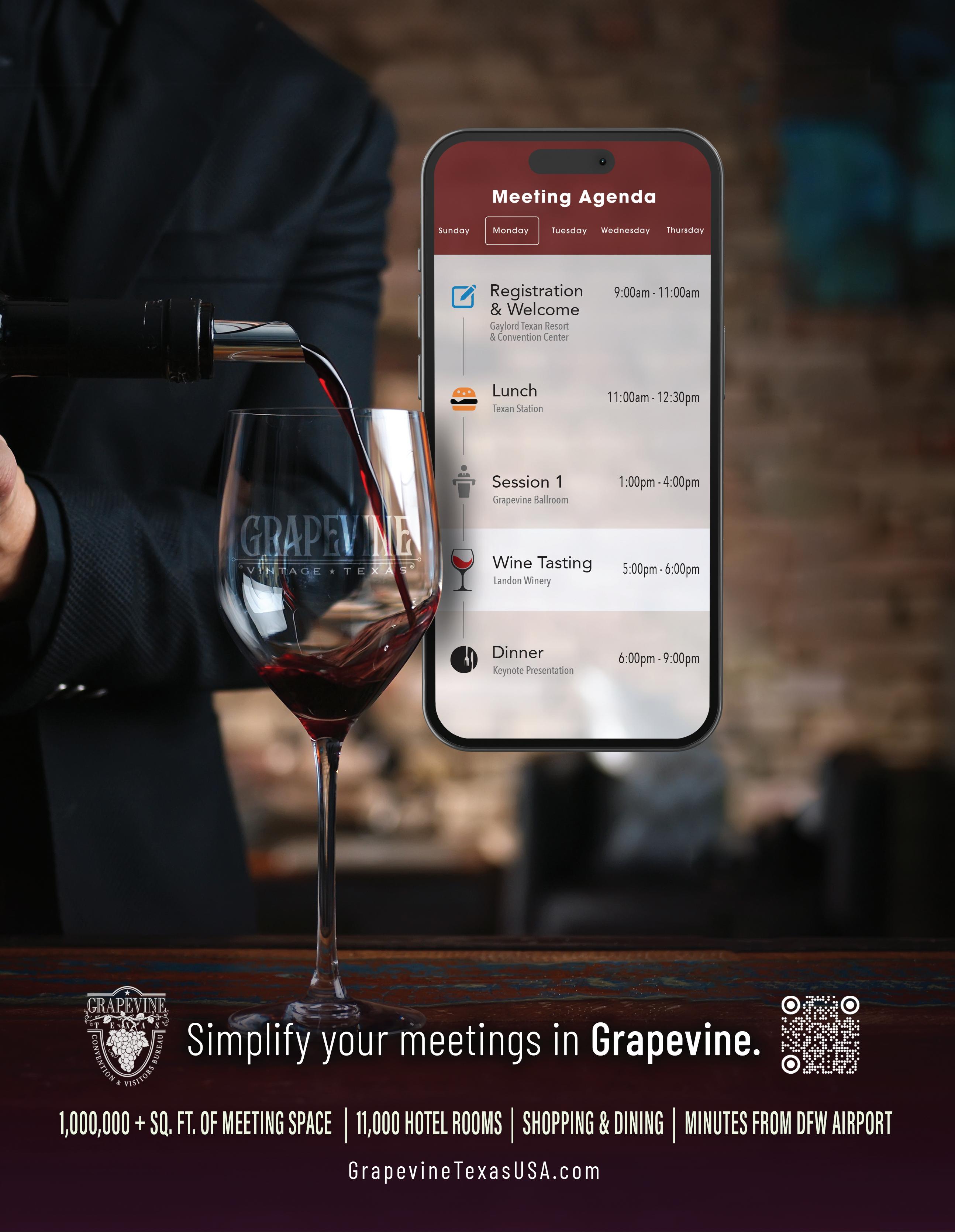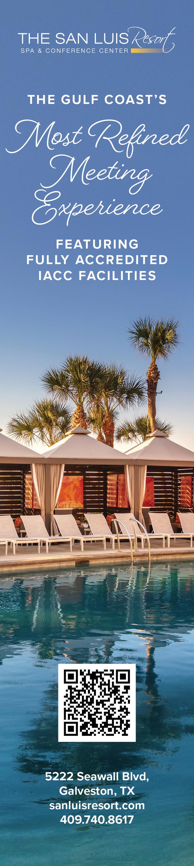 MEETINGSMAGS.COM/TEXAS 5 meetingsmags.com/texas PRESIDENT TAMMY GALVIN ASSOCIATE PUBLISHER – NATIONAL SALES RYAN MILLER 214-789-7716 | RMILLER@GREENSPRING.COM EDITORIAL DIRECTOR ALESHA TAYLOR GROUP EDITOR KATELYN BLOOMQUIST SENIOR EDITOR TODD R. BERGER EDITOR AMY DURHAM MANAGING EDITOR AMANDA CHRISTENSEN ASSOCIATE EDITOR LINDEN M. BAYLISS CREATIVE DIRECTOR TED ROSSITER ART DIRECTORS MICAH EDEL, CAROLINE ROYCE PRODUCTION DIRECTOR DEIDRA ANDERSON SENIOR ADVERTISING COORDINATOR TONY WAGNER ADVERTISING COORDINATORS SYDNEY KELL, ELLIANNA RADOVICH SALES + MARKETING SPECIALIST TAUSHA MARTINSON-BRIGHT DIRECTOR OF EVENTS MEGHAN GESS EVENT + OFFICE MANAGER RICK KRUEGER COMMUNICATIONS + EVENTS COORDINATOR JOSEPH SCHMIDT MARKETING + EVENTS COORDINATOR JORDYN TAYLOE DIRECTOR OF BUSINESS OPERATIONS KATHIE GORECKI ACCOUNTING ASSOCIATE AUSTIN SCHMELZLE AUDIENCE DEVELOPMENT DIRECTOR GERI WILSON AUDIENCE DEVELOPMENT MANAGER CINDY FISH REPRINTS For high-quality reprints of 500 or more, call 612-371-5849 or email danderson@greenspring.com. For address changes, ordering single copies, cancellations, or general questions about your subscription, please contact customer service at 866-660-6247. 9401 James Ave. S., Suite 152, Bloomington, MN 55431 Phone 612-371-5800 Fax 612-371-5801 HOUR MEDIA CEO STEFAN WANCZYK PRESIDENT JOHN BALARDO The pages between the covers of this magazine (except for any inserted material) are made from wood fiber that was procured from forests that are sustainably managed to remain healthy, productive, and biologically diverse. Texas Meetings + Events is published quarterly. © 2024 Greenspring Media. All rights reserved. PRINTED IN THE U.S.A. VISIT CONROE .COM MEET & RETREAT MARGARITAVILLE L AKE RESORT