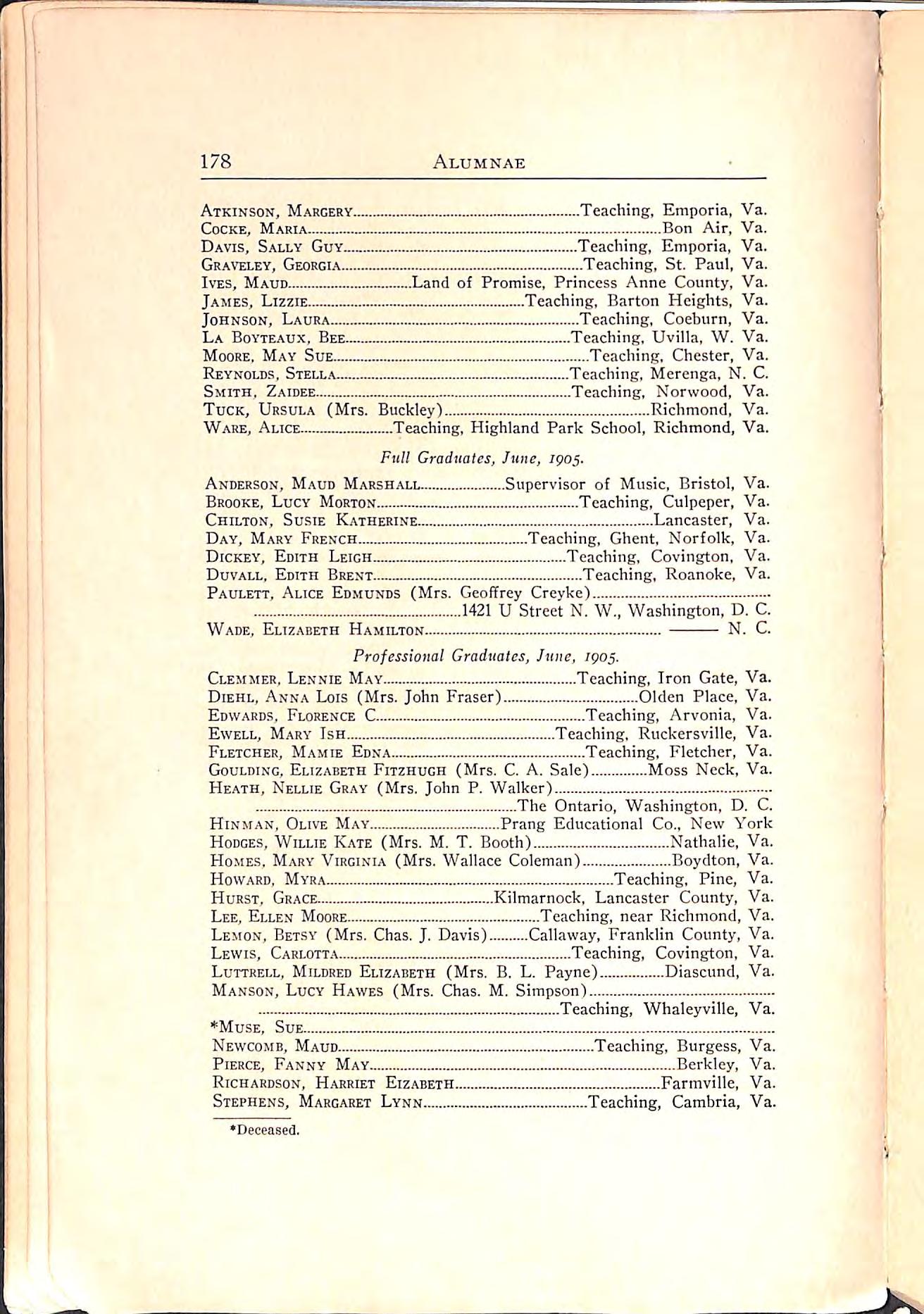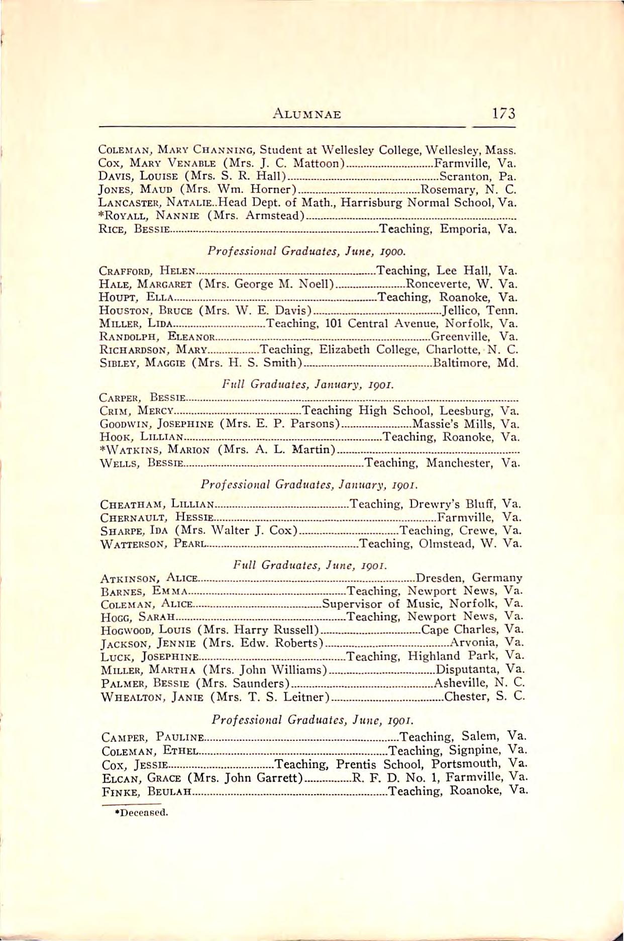 Bennett,Virginia -.Teaching, Newport News, Va. Bersch,Mary Clarice. Teaching,Diana Mills, Va. Bidgood,Annie Virginius Teaching,Burkeville, Va. Bland,Lillian Beverly Teaching,531 NorthSt.,Portsmouth,Va. Bliss,Caroline Helen Teaching,531 North St.,Portsmouth,Va. Boatwright, Nellie Tyler Teaching, Fredericksburg, Va. Brown,Ethel Louise Teaching, Waverly, Va. Carter,AliceElizabeth Teaching,Steel'sTavern,Va. Caruthers,Carrie Ninde Teaching,Waverly,Va. Chrisman,Hallie Bryarly Teaching, Faber, Va. Clayton,Florence Merritt. Office Asst.,S.F.N.S.,Farmville,Va. Cox,HattieRebecca - Teaching,Danville, Va. Davis, Alice Evelyn Teaching, R. F. D. No. 2, Hampton, Va. Davis,Margaret Morton Teaching, Dumbarton, Va. Davis,Sudie Pate Teaching,Paces,Va. Delp, Lillie Virginia Teaching, R. F. D. No. 1, Rural Retreat, Va. DuPuy, Mary Purnell. Teaching, Pocahontas, Va. Parish,Emma Stockton Teaching,Rivanna,Va. Fitzgerald, Sallie Tazewell Teaching, Pocahontas, Va.
