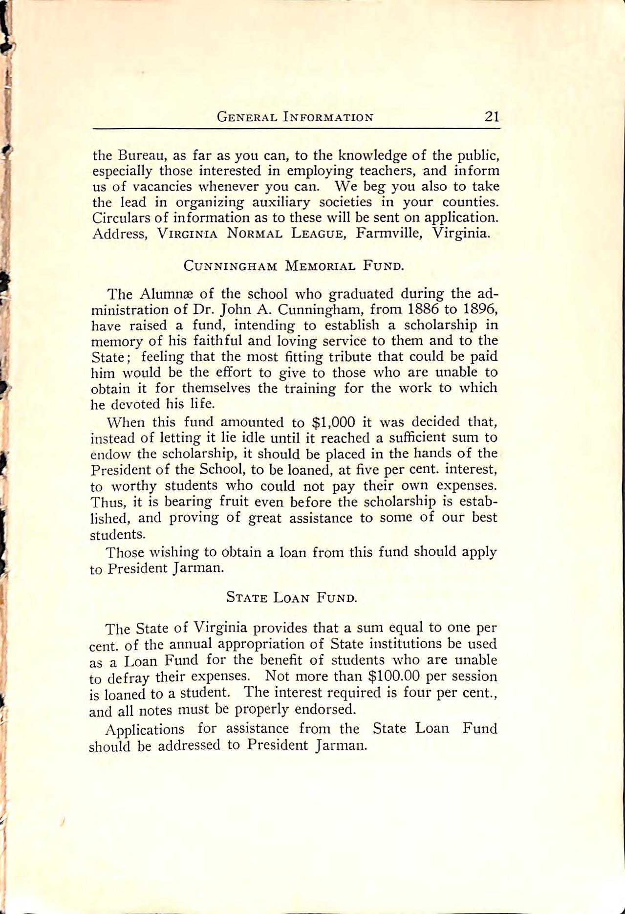 The State of Virginia provides that asum equalto one per cent,of the annual appropriation of State institutions be used as a Loan Fund for the benefit of students who are unable to defray their expenses. Not morethan $100.00 persession is loaned toastudent. The interestrequired is four per cent., and all notes must be properly endorsed.