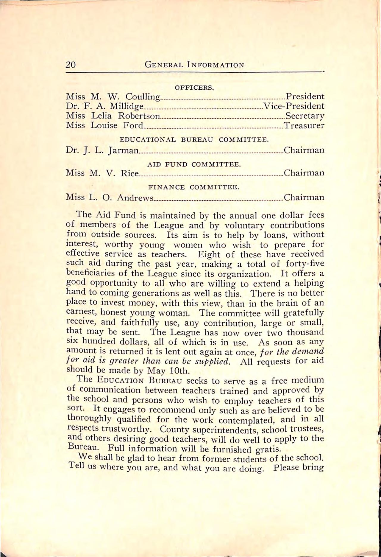 The Aid Fund is maintained by the annual one dollar fees of members of the League and by voluntary contributions from outside sources. Its aim is to help by loans, without interest, worthy young women who wish to prepare for effective service as teachers. Eight of these have received such aid during the past year, making a total of forty-five beneficiariesoftheLeague sinceitsorganization. Itoffersa good opportunity to all who are willing to extend a helping handtocominggenerationsas wellasthis. Thereis nobetter place to invest money,with this view,than in the brain of an earnest,honest young woman. The committee will gratefully receive,and faithfully use,any contribution,large or small, that may be sent. The League has now over two thousand six hundred dollars, all of which is in use. As soon as any amountis returned itislentoutagain atonce,for thedemand for aid is greater than can he supplied. All requests for aid should be made by May 10th.