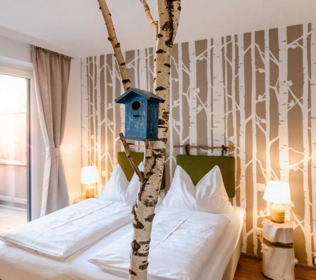 Alle Zimmer & Apartments sind liebevoll, einfallsreich, mit Vintage-Möbeln und ungewöhnlichen De ko-Überraschungen eingerichtet. Tradition und Moderne verschmelzen so zu einem spannenden & ein zigartigen Konzept. Jedes Stockwerk hat sein eigenes Thema: Im Erdgeschoss schlaft Ihr im „Garten“, im ersten Stock in der „Baumzone“ und im zweiten Stock im „Gebirge“. Und wer ein bisschen mehr Abenteuer & Freiheit sucht, für den ist der Glamping Dome oder das Tiny House im Garten genau das Richtige. Beim Frühstücksbuffet und im kleinen Restaurant mit Flammkuchen und frisch gebratenem Steckerlfisch aus den Salzkammergut-Seen legen wir viel Wert auf regionale, hochwertige Zutaten. Ein echtes Highlight für Groß und Klein sind unsere Alpakas und Miniponys, sie sorgen immer für gute Laune und ganz besonde re Urlaubsfotos! Ein gemütlicher Spazierweg führt nach nur 800m in die schöne Berau Bucht. Badeplatz, Fitnessraum, Sauna, Sportverleih usw. können selbstverständlich mitgenutzt werden.