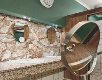 Einen Hauch Glamour erleben in den neu renovierten Sanitäranlagen. Top: Styling-Bereich mit Hollywood Flair!