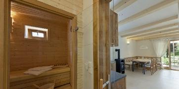 Gemütlicher Wellnessgenuss mit modernem Komfort im großzügigen In- und Outdoorbe reich - und das alles im lässigen Almhüttenstyle.