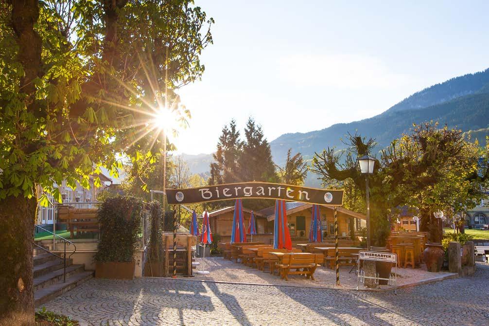 Unter den Kastanienbäumen findet sich im Biergarten schnell ein schattiges Plätzchen zum Genießen. Auf der Speisekarte stillen typisch bayerische Gerichte wie Schweinsbraten, Brotzeit oder Rostbratwürstl den Hunger und ein kühles Bier aus der Berchtesgadener Hofbrauerei sorgt für Erfrischung.