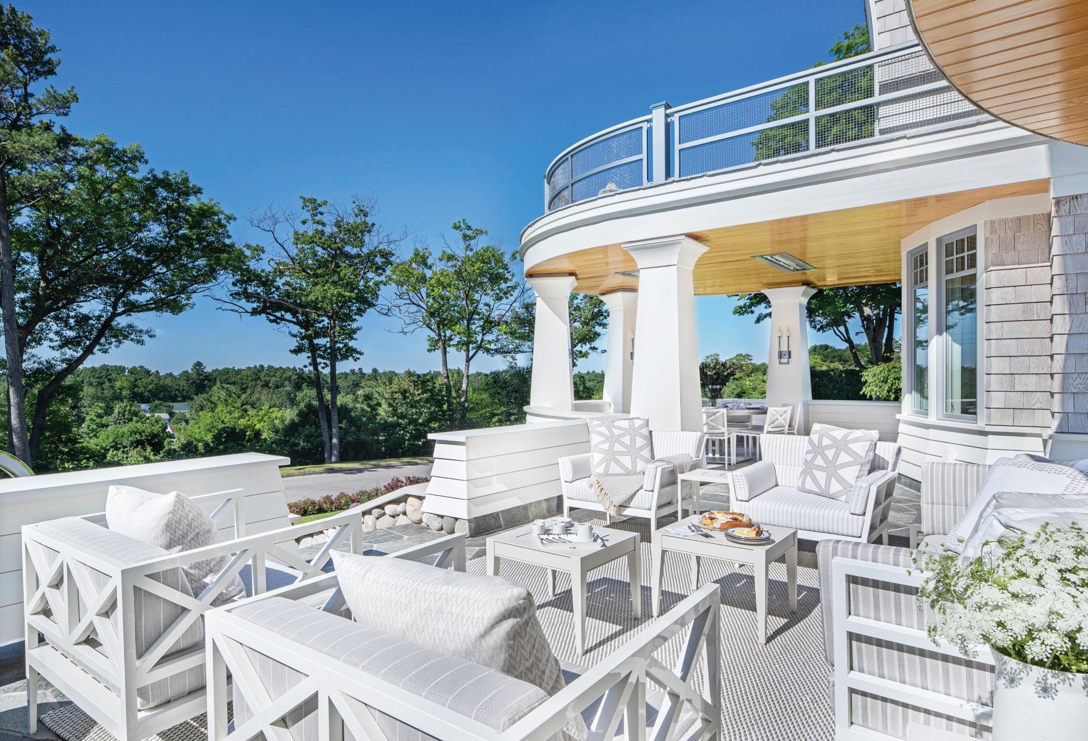 Outdoors, stylish black steel tables and chairs (orginal Russell Woodard/Sculptura) make their home on the sprawling deck. Views of a horse farm, matte-black benches and planters, and cinnamon-red shade umbrellas create a serene feel.