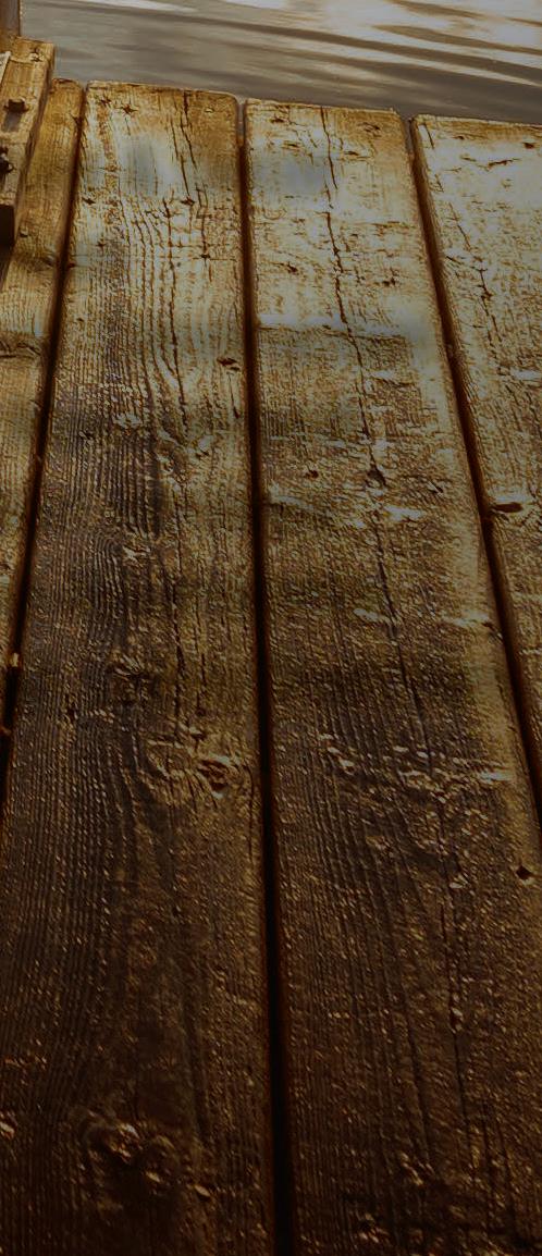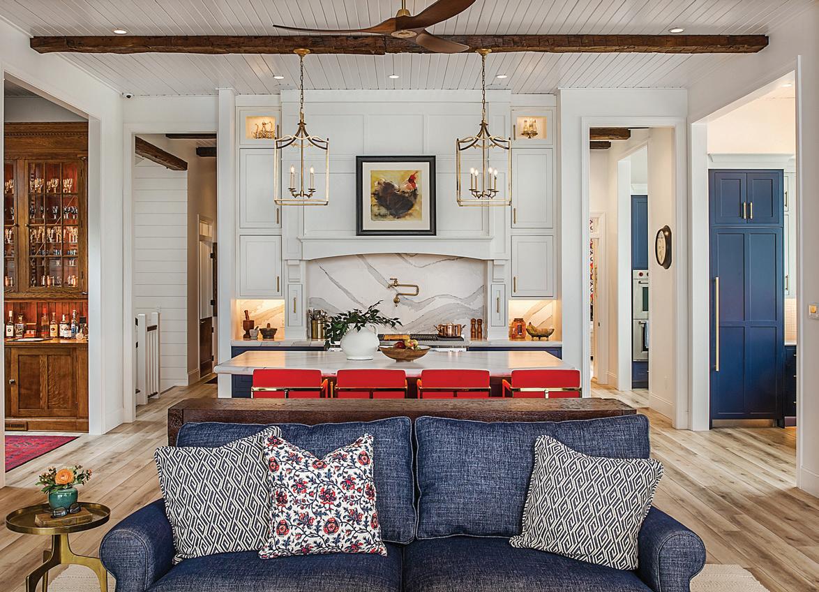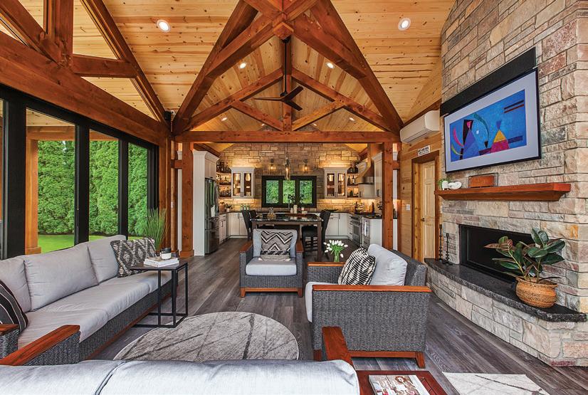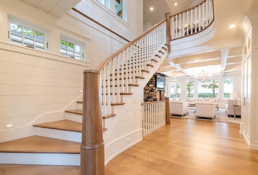 help but be impressed by the vastness of its space, while simultaneously feeling embraced by its warmth. This balance was ultimately achieved by designing specific areas for daily activities, while retaining the home’s open concept, designer Birch says. Nearly every surface of the interior is made of wood, which was chosen to provide a sense of quality and as a nod to its nautical roots. Shiplap, bead board, and hand-hewn beams offer a variety of textures. A dramatic threestory stairs tower is a showpiece that also offers an abundance of natural light.