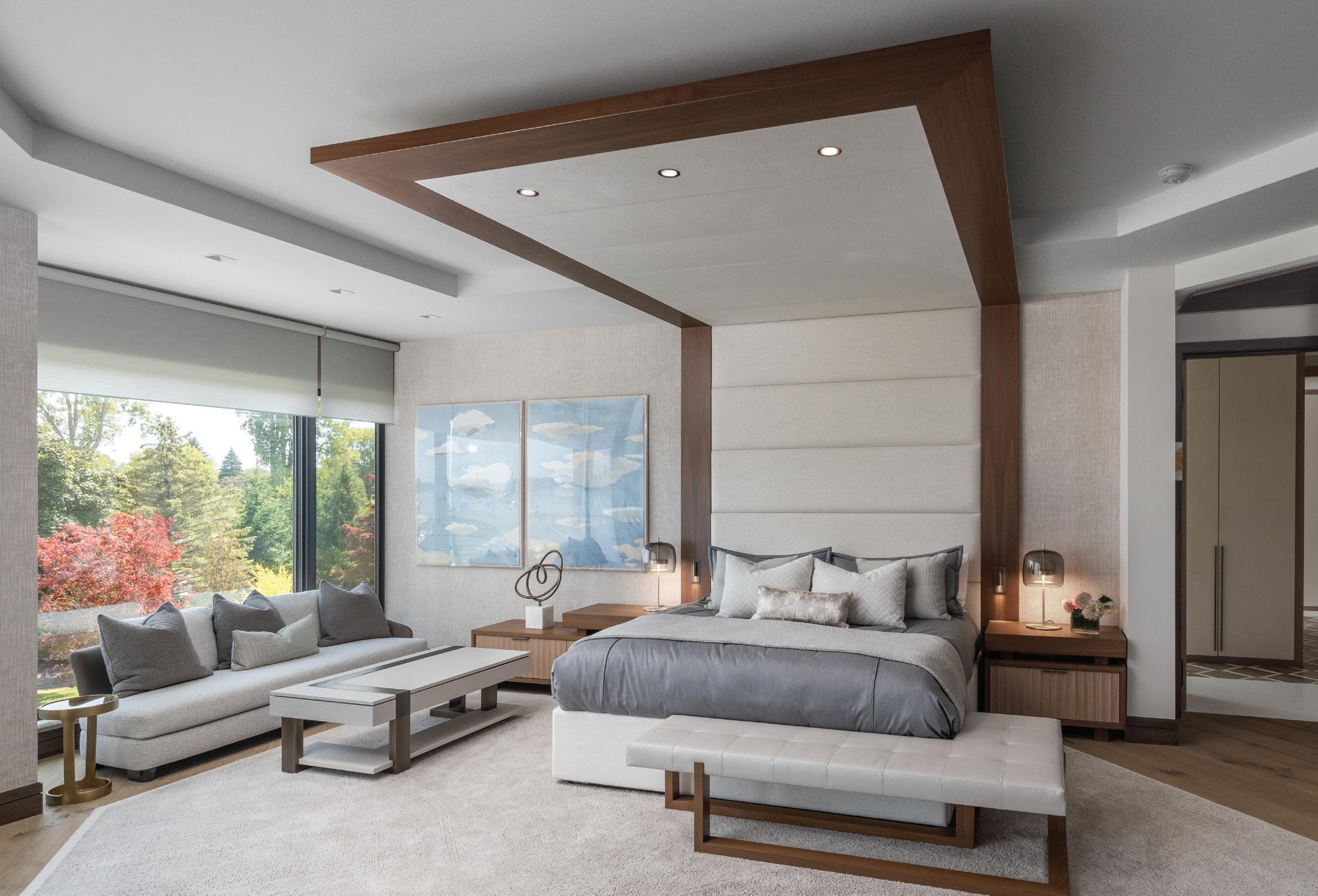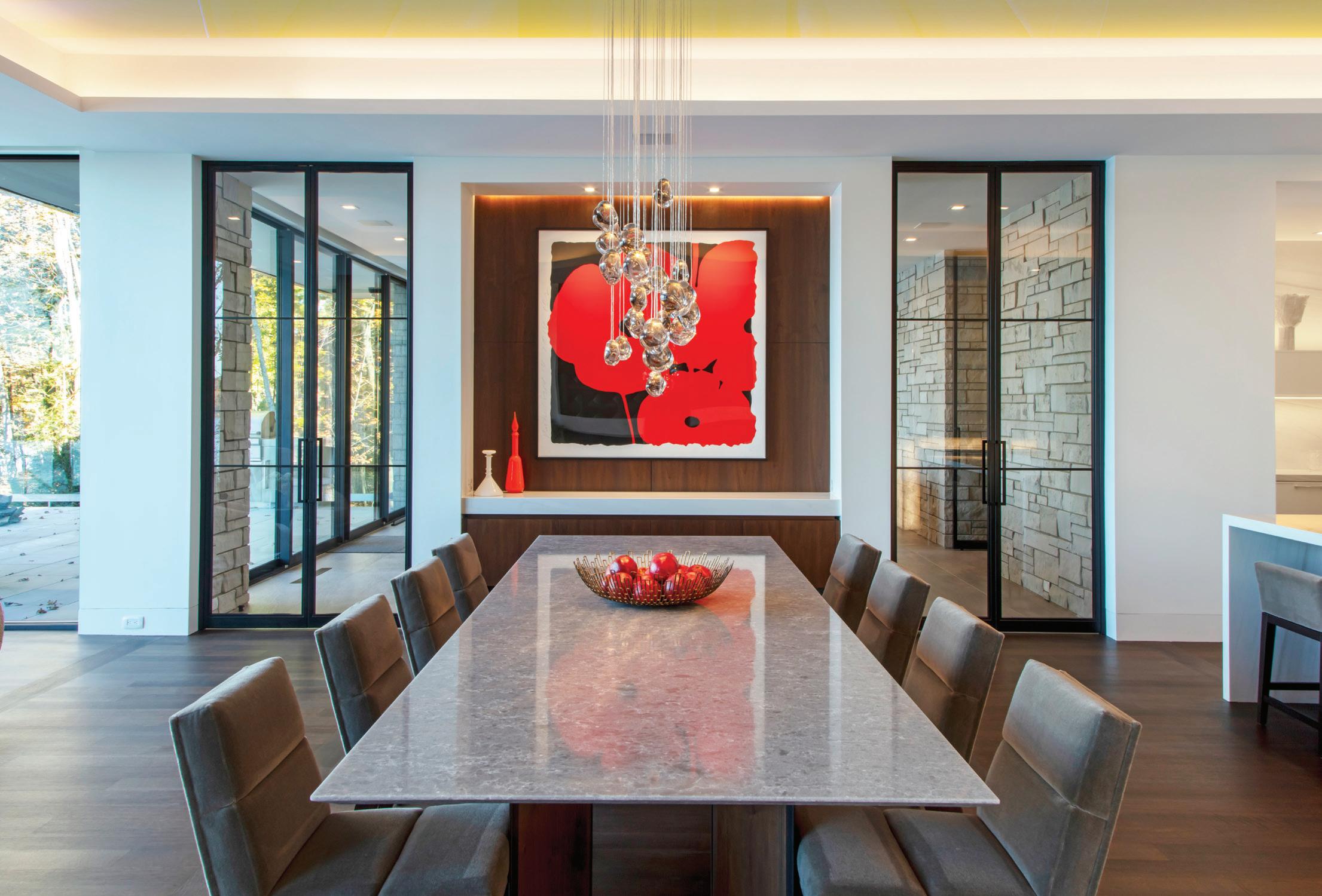 The heart of the residence is the kitchen, which is wrapped in white millwork. A large quartz island stands front and center, overlooking the full expanse of the great room and dining room. Brass lighting fixtures are scattered throughout, and contrast nicely against a double-sided stone fireplace thoughtfully