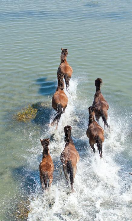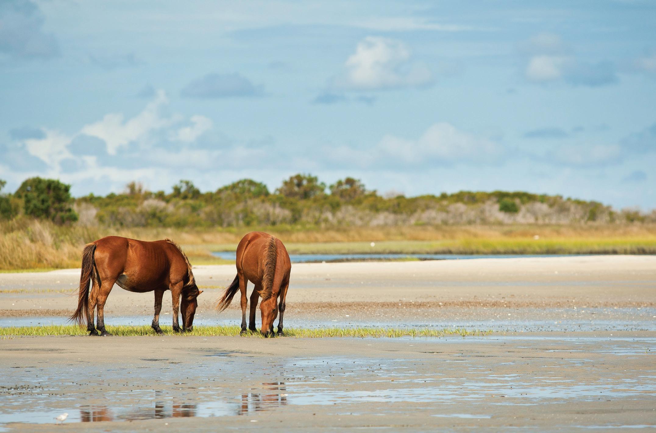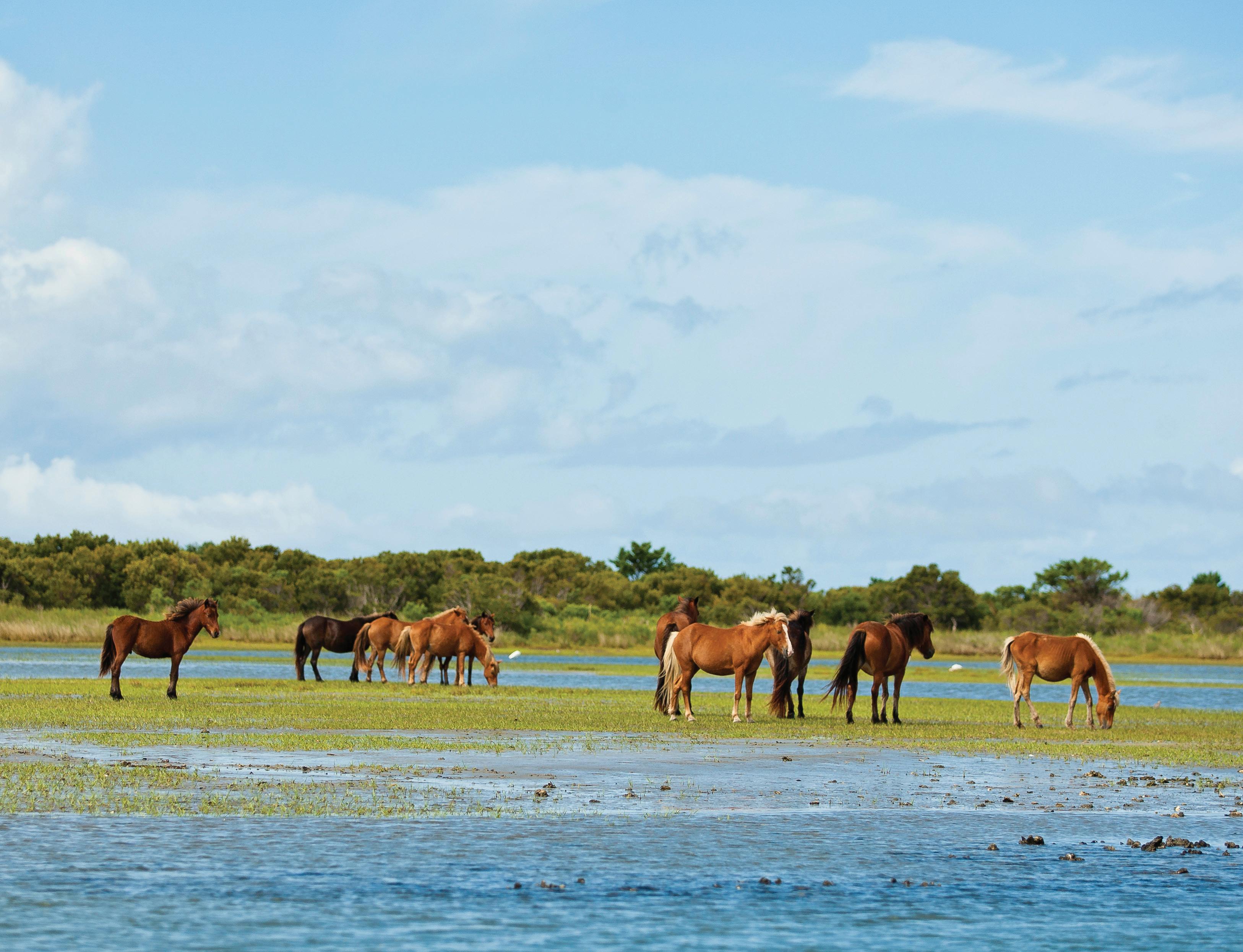 The origins of the wild horses found on some barrier island chains on the East Coast are a bit of a mystery. These Iberian horses descended from herds that may have migrated or been abandoned as early as the 1500s, but their exact journey through history is debated. The present-day herd of wild horses found near Crystal Coast, North Carolina, numbers about 110. They can be found on Shackleford Banks, part of the Cape Lookout National Seashore, and a separate strain of feral horses can be found on the Rachel Carson National Estuarine Research Reserve.