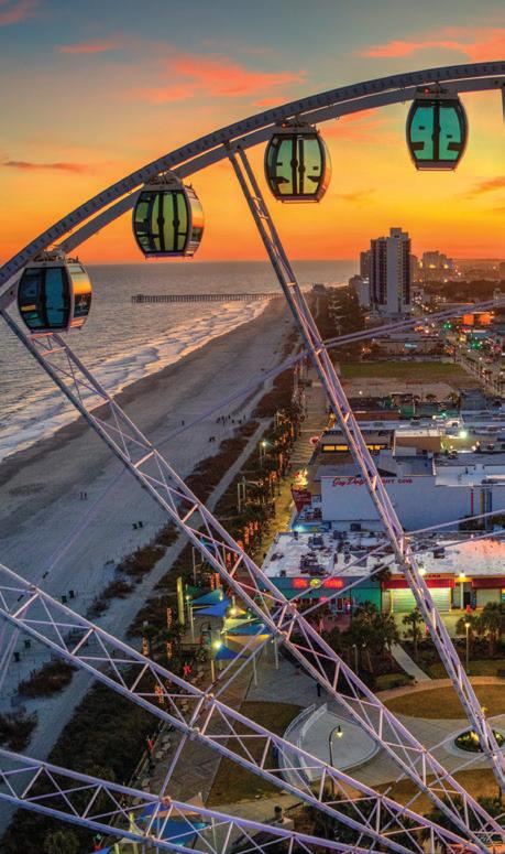 One of the boardwalk’s most iconic attractions is the SkyWheel, which opened in 2011. The 187-foot-tall Ferris wheel has enclosed climate-controlled gondolas. Groups can hop in and ride to the top for unparalleled views of Myrtle Beach and the ocean during any season. If they’re looking to do a little shopping, the must-visit location on the boardwalk is the Gay Dolphin, a family-owned gift shop opened in 1946 with multiple levels of trinkets and gifts for any traveler. Additionally, arcades on the boardwalk feature everything from pinball to Skee-Ball, and Ripley’s Crazy Golf is a great place for groups to try their hand at mini-golf.