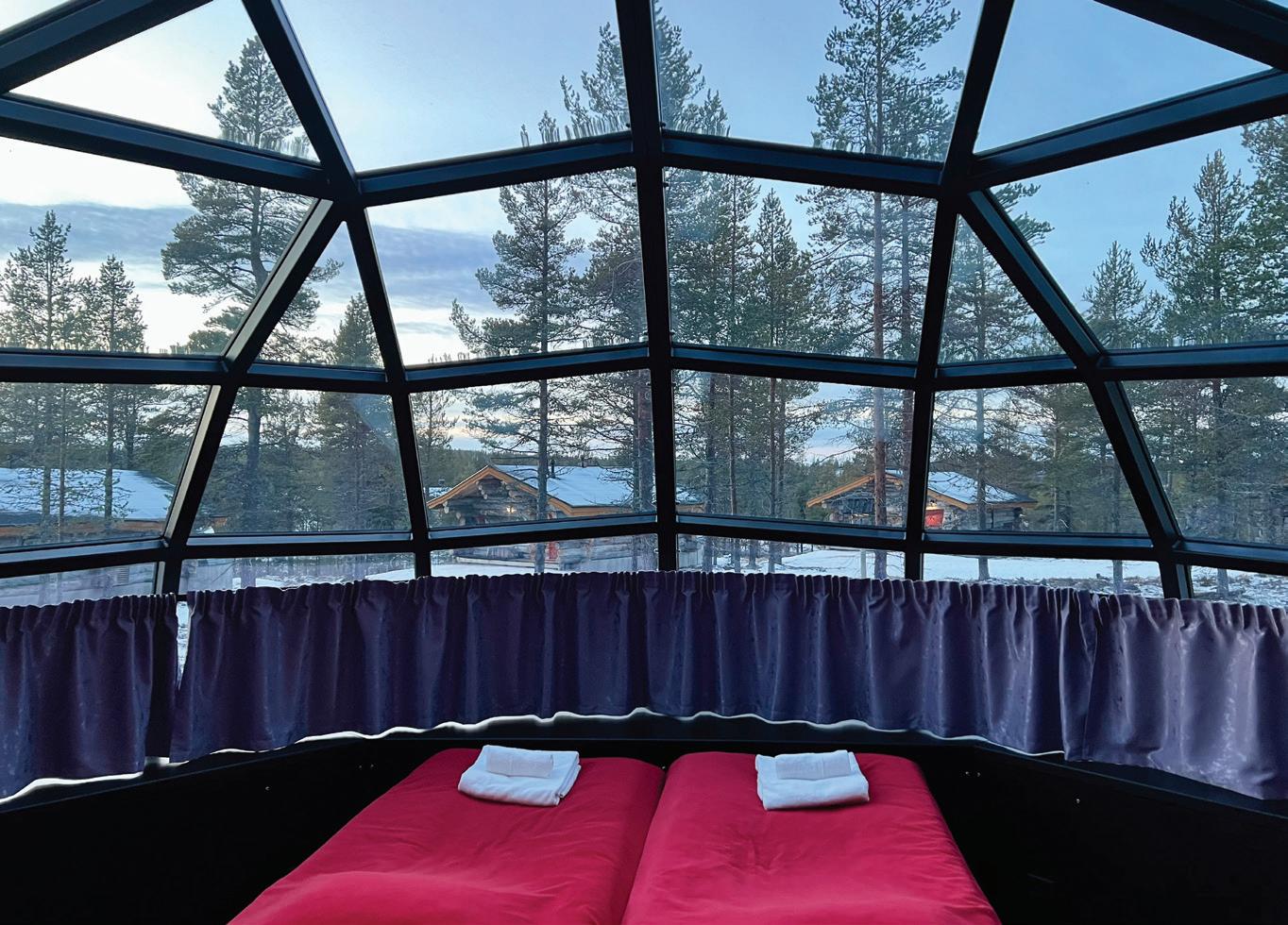 In late afternoons, for a few in our group, the resort’s Igloo Bar became a familiar place in a faraway land. Its arching windows spread across the ceiling and offered unobstructed views of Lapland’s darkening skies.