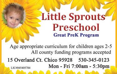 15 Overland Ct. 530-345-0123 littlesproutspreschool1@gmail.com D L Y S Little Wonders 3-5 years 8am-12:30pm Monday-Thursday