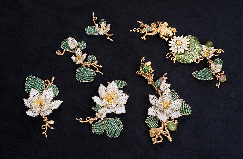 Above: Lawrence Beck (American, born 1962), Sterling Forest Water Lily I, 2007, C-print photograph, mounted on aluminum, Taubman Museum of Art, Gift of Mitchell Kaneff, 2018.004; Left: Mindy Lam, Lotus Dream #1-#6, Peridot, citrine, watermelon tourmaline, 14kt. gold-filled wire, Swarovski crystals, assorted vintage brooches, Courtesy of the Artist; Photos by Boyd Pearman