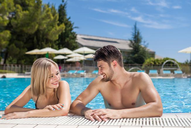 Es steht ein großer Süßwasseraktivpool (1,40 m tief) mit Wasserattraktionen zur Verfügung, ein beheizter Ruhepool (1,30 m tief), über dachter Kinderpool (40 cm tief ), sowie eine Wasserrutsche.