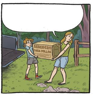 d) Señala las dos afirmaciones que son verdaderas. La familia vive en una granja. La madre quiere criar cerdos. Nombran a la niña encargada de los pollos. En el cómic aparecen cuatro personajes diferentes.