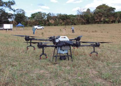 de de até 40 l, e outros modelos com capacidade ainda maiores já sendo lançados ou em fase de testes, podendo chegar a quase 300 l. O uso de drones nas lavouras tem alguns pontos considerados positivos, bem difundidos em ações de marketing pelas empresas fabricantes desses equipamentos. Por exemplo, possibilidade de realizar aplicações localizadas, evitando o amassamento, com doses ajustadas às ne-