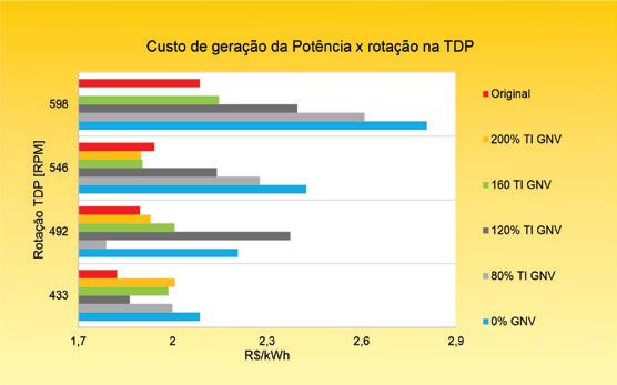 Os resultados permitiram detectar o custo de geração da potência com cada mistura de combustível diesel e biometano. Os valores de geração de potência foram obtidos com base na cotação comercial dos combustíveis, disponíveis na rede comercial de postos. Na rotação de trabalho do trator (540 rpm na TDP), os menores custos de geração de potência foram obtidos no sistema bicombustível diesel e GNV, com redução de 2% no custo com combustível (considerando-se