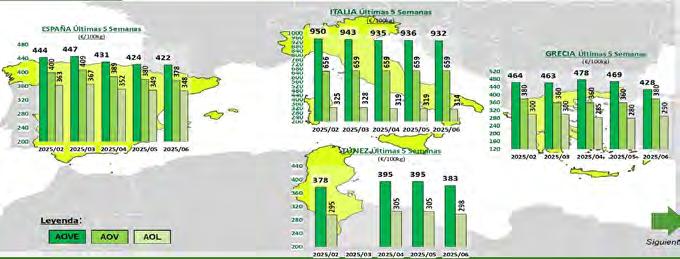 Evolución de los precios en los mercados productores de aceite de oliva en el Mediterráneo correspondientes a la semana sexta de campaña. Se observa como Italia mantiene sus cotizaciones más altas con respecto a Grecia y Túnez, y con incremento entre el 15,9% y 120,6% según calidad con respecto a España. Consulta: 27 de febrero de 2025.