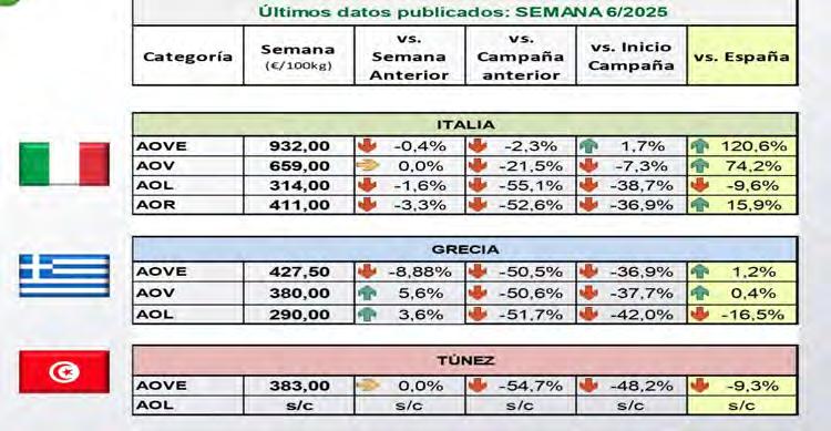 El mercado del aceite de oliva evoluciona con importantes cambios en las cotizaciones de las diferentes calidades del aceite de oliva. La tabla comparativa muestra como en la misma semana de esta última campaña, el precio no alcanza a la correspondiente a 2023, en los tres países productores. El descenso es significativo en todos los páises excepto en Italia que´mantiene muy elevados sus precios. Consulta: 27 de febrero de 2025. Fuente: DG AGRI, ISMEA, MAPA.