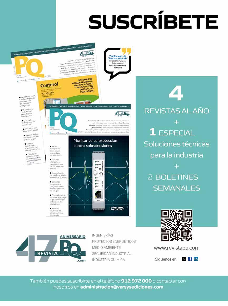 Formación. El sector químico vasco advierte sobre la escasez de talento. PRFV. La revolución plástica que desafía a los materiales metálicos. Eficiencia operativa. 6 ventajas de la monitorización continua en el mantenimiento predictivo . RAEE. Reciclaje innovador para cerrar el ciclo de materias primas críticas. Proyectos. Cinco tecnologías para convertir CO2 en productos químicos de valor agregado. @revista_PQ revistapq.com revista-PQ