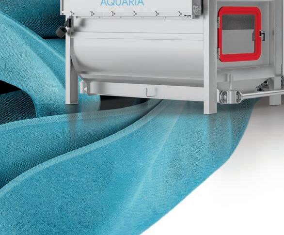 AQUARIA® - A continuous open-width washing system with intense mechanical action and extended dwell time which revolutionizes the treatment of terry fabric: • Eco-bleaching with a reduction in water consumption by over 90% compared to traditional systems, and an almost complete elimination of harmful chemicals • Post-dyeing wash with up to 70% reduction in water consumption for optimal color fastness • Improved fabric uniformity and quality in all applications, with increased softness and volume.