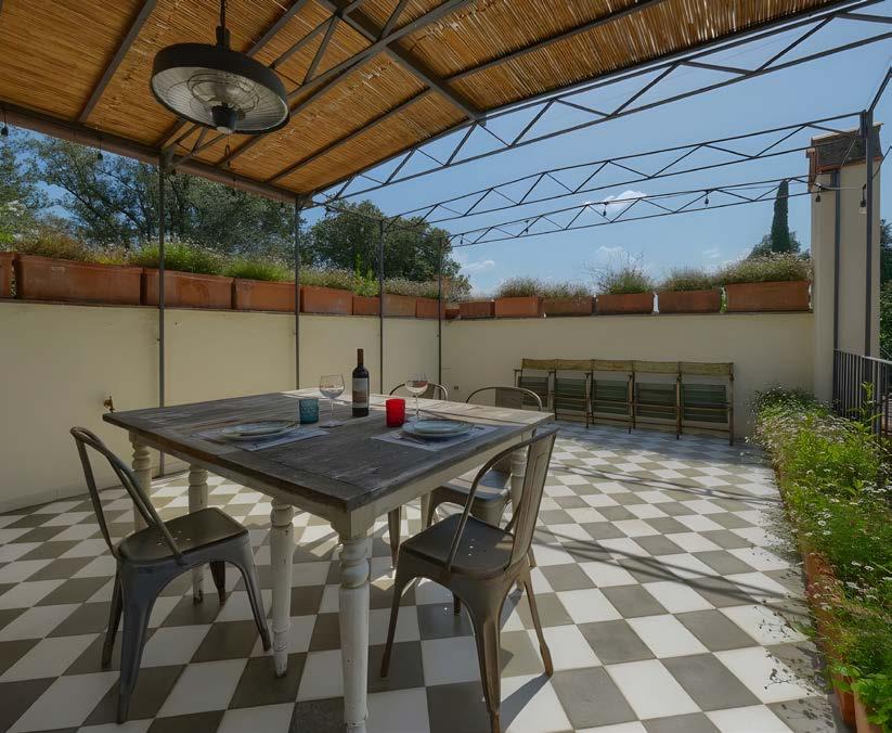 The terrace, overlooking the garden and the pool, offers a versatile and evocative space, perfect for relaxing, sunbathing or organising outdoor events and dinners.